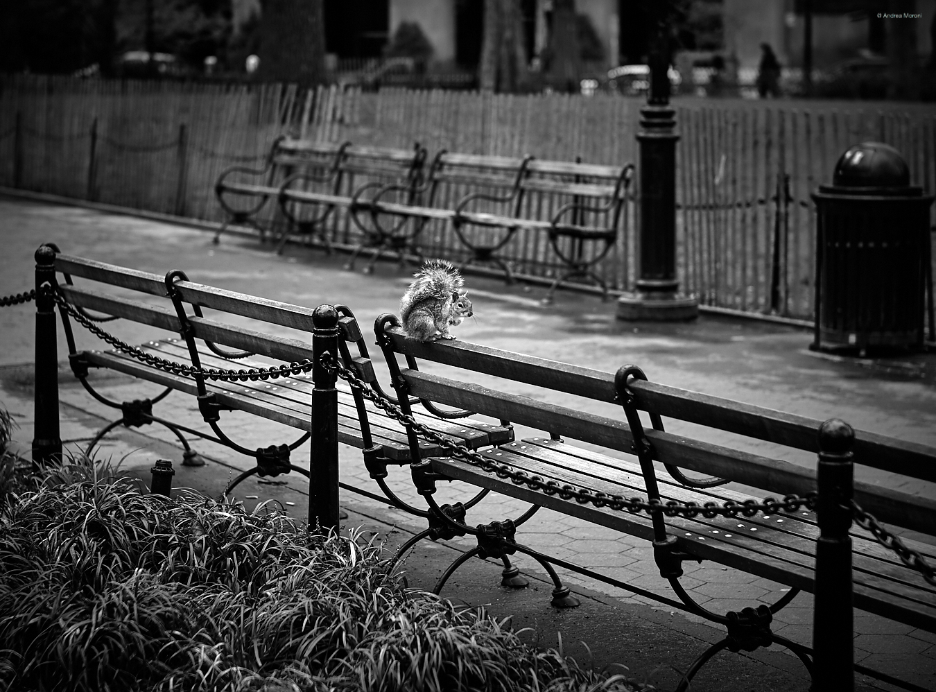 Squirrel on a bench.